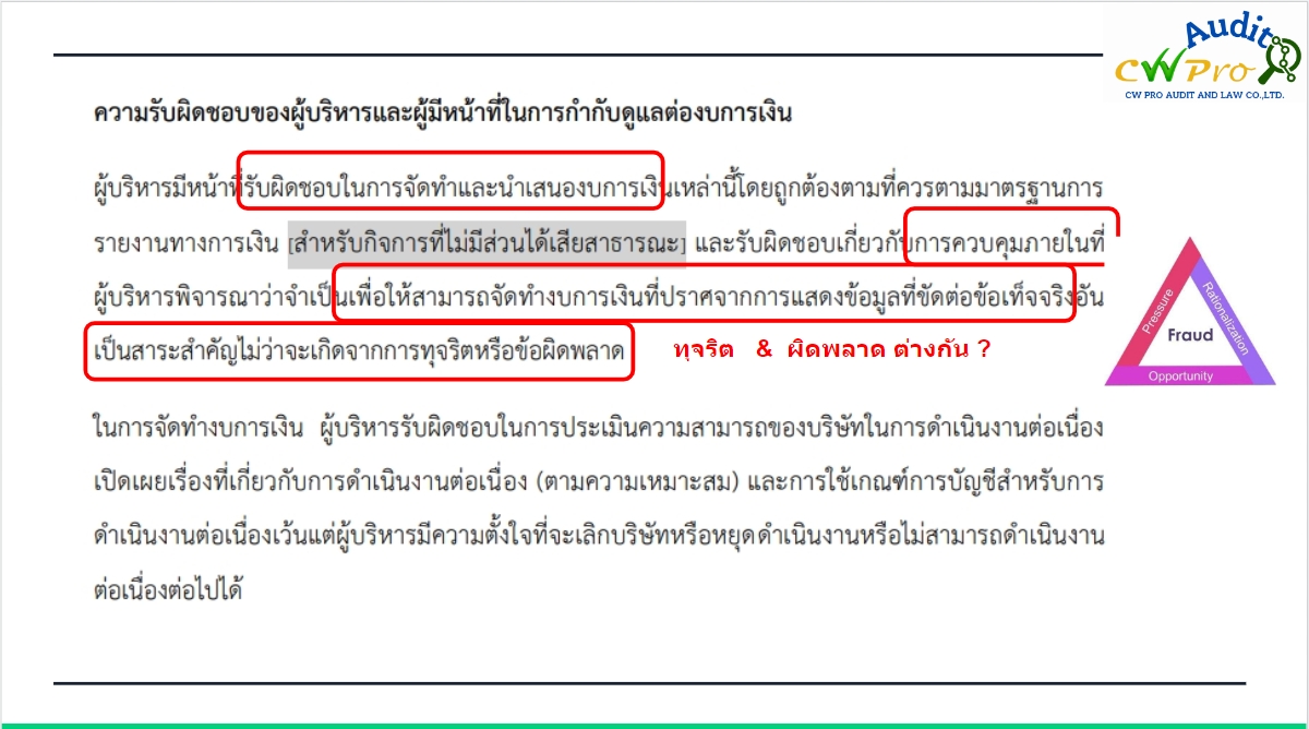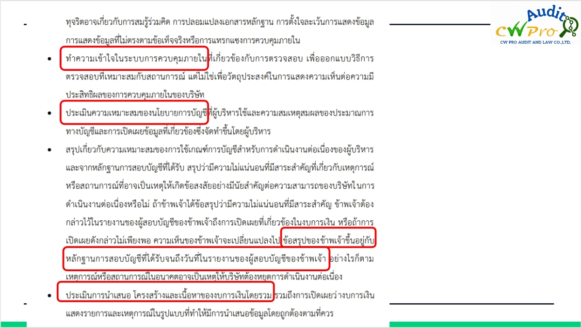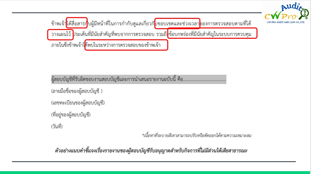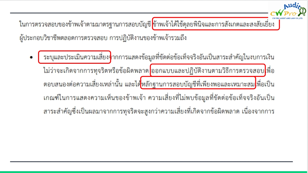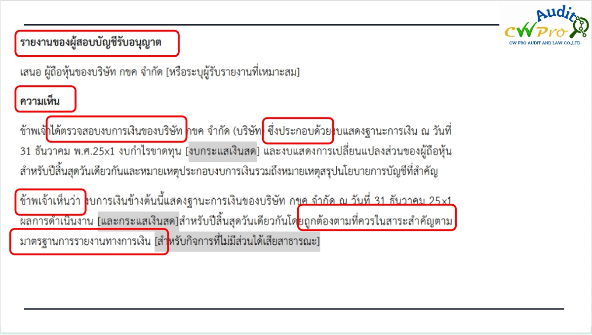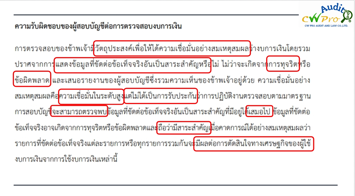 “การตรวจสอบงบการเงินมีวัตถุประสงค์เพื่อให้ผู้สอบบัญชีสามารถแสดงความเห็นต่องบการเงินว่างบการเงินนั้นได้จัดทำในส่วนสาระสำคัญ